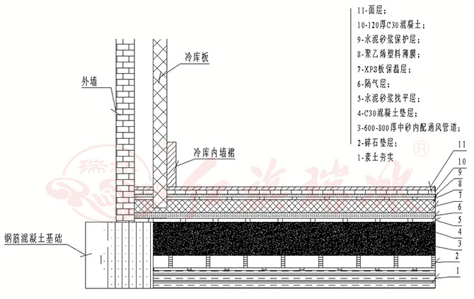 三、大型冷庫的地面保溫環節要更復雜一些。由于面積較大,通常需要鋪設通風管道防止地面凍鼓破裂。再鋪設XPS擠塑板,通常低溫冷庫需要鋪設150mm~200mm厚的XPS擠塑板,而高溫冷庫鋪設100mm~150mm厚的XPS擠塑板,鋪設擠塑板時需要錯開鋪設。大型冷庫需要做好防潮隔汽層,與中型冷庫相同,鋪設在擠塑板的上下兩面。做好這些再澆筑鋼筋混凝土。再根據要求做好金剛砂地坪或者環氧地坪。